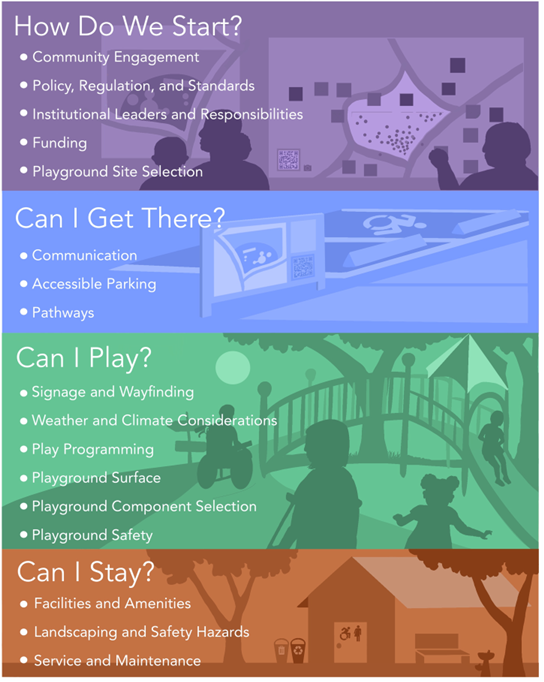 The considerations and strategies have emerged primarily from an international environmental scan of practice-oriented materials concerning inclusive playgrounds. The playbook is structured around four key questions: