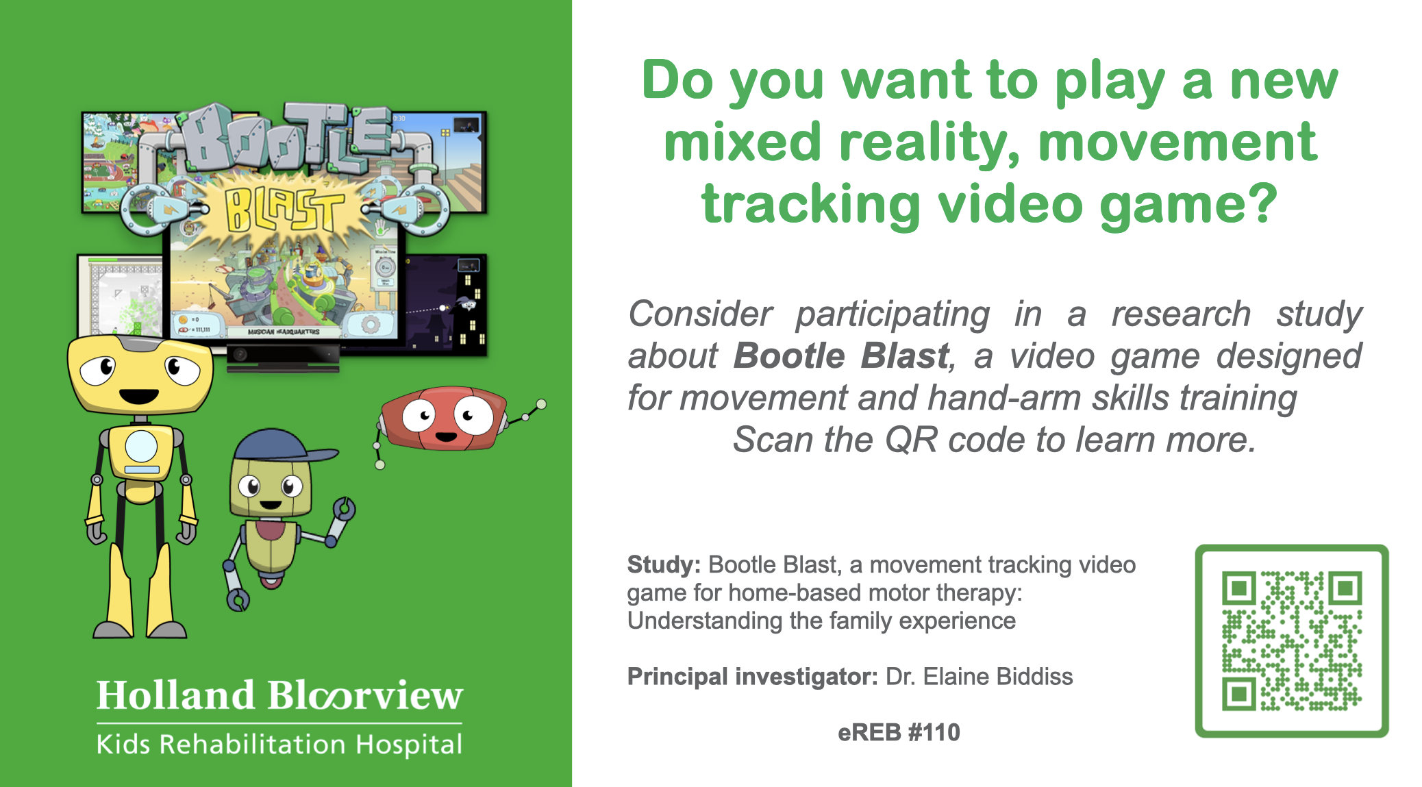 Research Plan. To understand real-world implementation, Bootle Blast will be trialed for 14 weeks in the homes of 60 young people (6 to 17 years) with any motor condition that could be addressed by the Bootle Blast system, regardless of their diagnosis. We will assess feasibility (e.g. independent home setup, ability to set/meet self-directed play time goals), enablers/barriers to use, and perceived value. User experience will inform product, training and resource development.